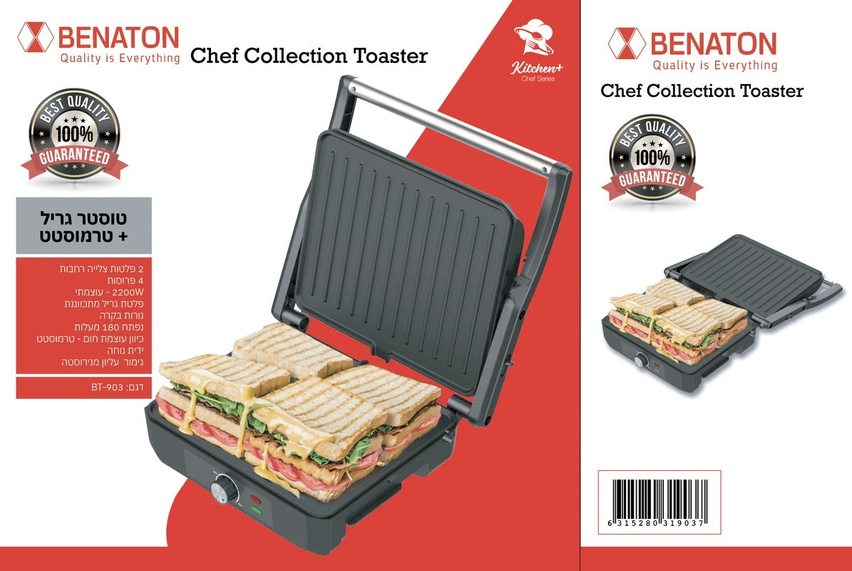 טוסטר גריל ענק 4 פרוסות עוצמתי במיוחד 2200W – מבית BT-903 BENATON
