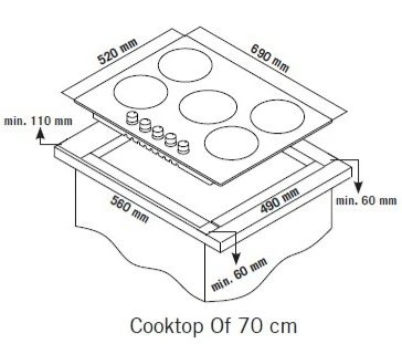 בגודל 70 ס”מ•רוחב הכיריים: 690 מ”מ•אורךהכיריים: 520 מ”מ•מידות החיתוך (החלק המיועד להתקנה בתוך השיש):•רוחב: 560 מ”מ•אורך: 490 מ”מ•מרווח מינימלי להתקנה מהשיש:•צדדים: 60 מ”מ•קידמי: 110 מ”מהכיריים מיועדות להתקנה בגומחה בשיש בהתאם למידות החיתוך.