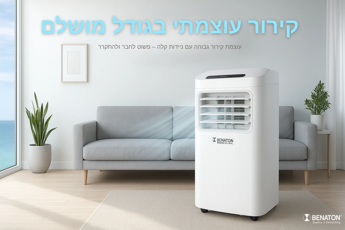 אם אתם מחפשים פתרון נייד, עוצמתי ונוח לשימוש בכל עונות השנה – הגעתם למקום הנכון. המזגן הנייד BT-9009 מבית BENATON מציע ארבע פונקציות מרכזיות במכשיר קומפקטי ואיכותי: קירור, חימום, ייבוש לחות ואוורור. הוא מתאים לשימוש בחדרים בגודל של עד 15 מ"ר, קל להזזה, ומגיע עם שלט רחוק לנוחות מקסימלית.