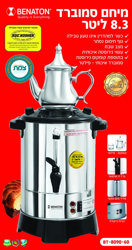 מיחם לשבת מאושר לשימוש ופטור מטבילה 8.3 ליטר סמוברד עם קומקום מעוצב וינטאג׳ למשקאות חמים BT-8090-60