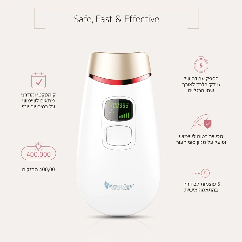 המכשיר בטוח לשימוש ופועל על מגוון סוגי העור והשיער.