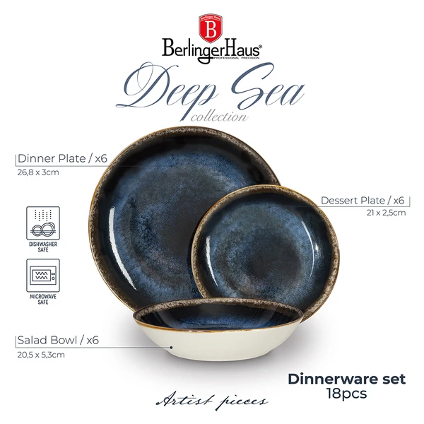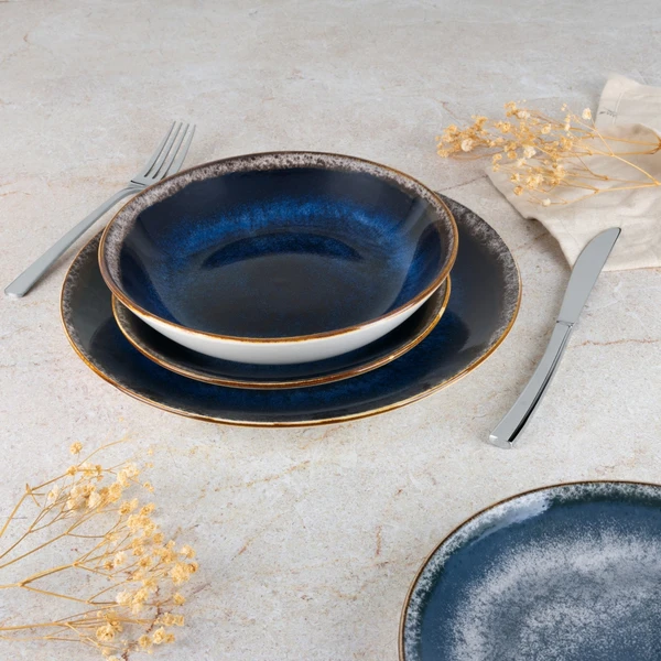 סט כלי אוכל מרהיב מסדרת Deep Sea בעיצוב אומנותי בהשראת עומק הים — שילוב ייחודי של גווני כחול עמוקים עם שוליים בגוון חם היוצרים מראה יוקרתי, טבעי ובעל נוכחות. כל פריט מעוצב כיצירת אמנות ומעניק לשולחן האוכל תחושת בוטיק אלגנטית, מושלמת לאירוח מרשים ולשימוש יומיומי ברמה גבוהה.