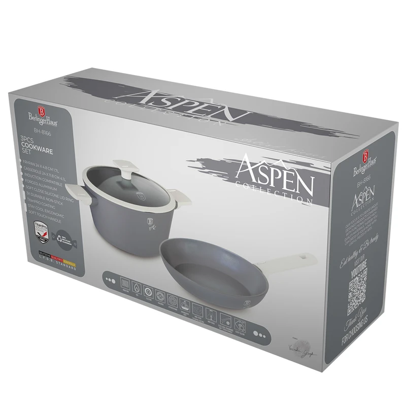 סט בישול אלגנטי מסדרת ASPEN Collection מבית Berlinger Haus, בעיצוב מודרני בגימור אפור מט, המשלב מראה נקי ויוקרתי עם ביצועי בישול מתקדמים לשימוש יומיומי נוח ויעיל.