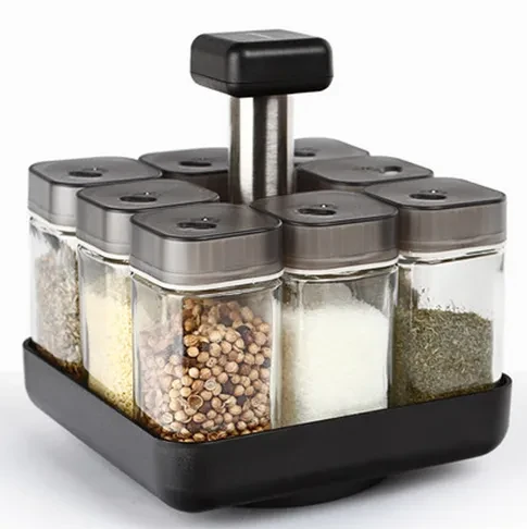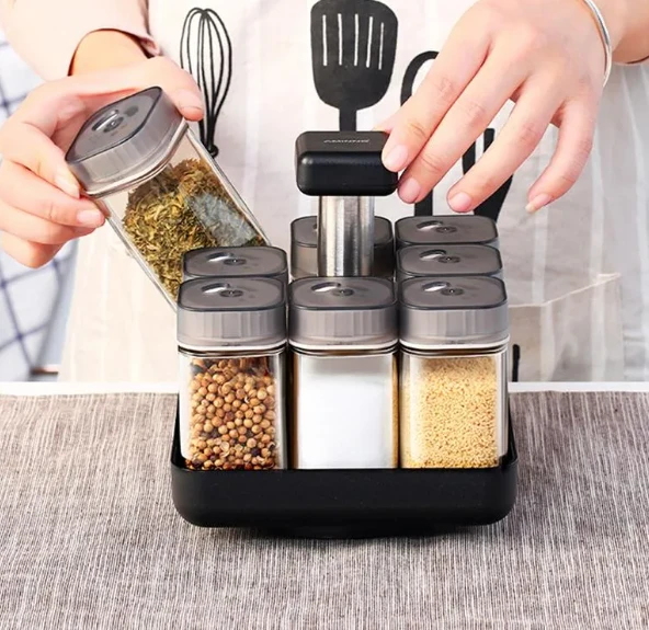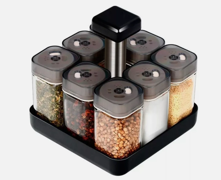 סט מעמד תבלינים מסתובב, מושלם לארגון התבלינים ושמירה על טריותם.