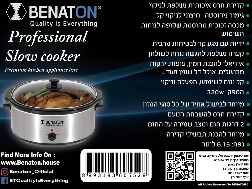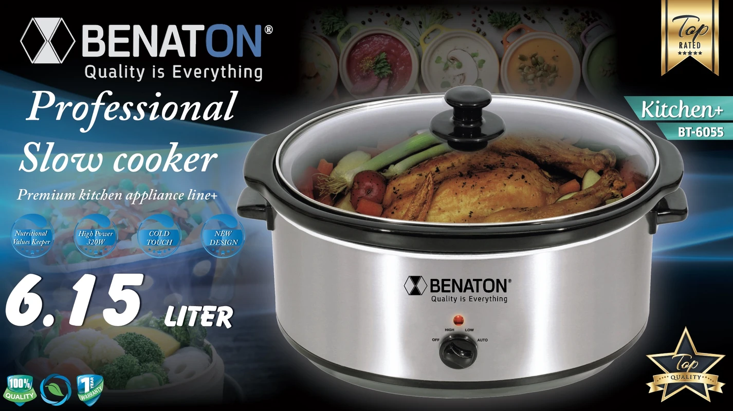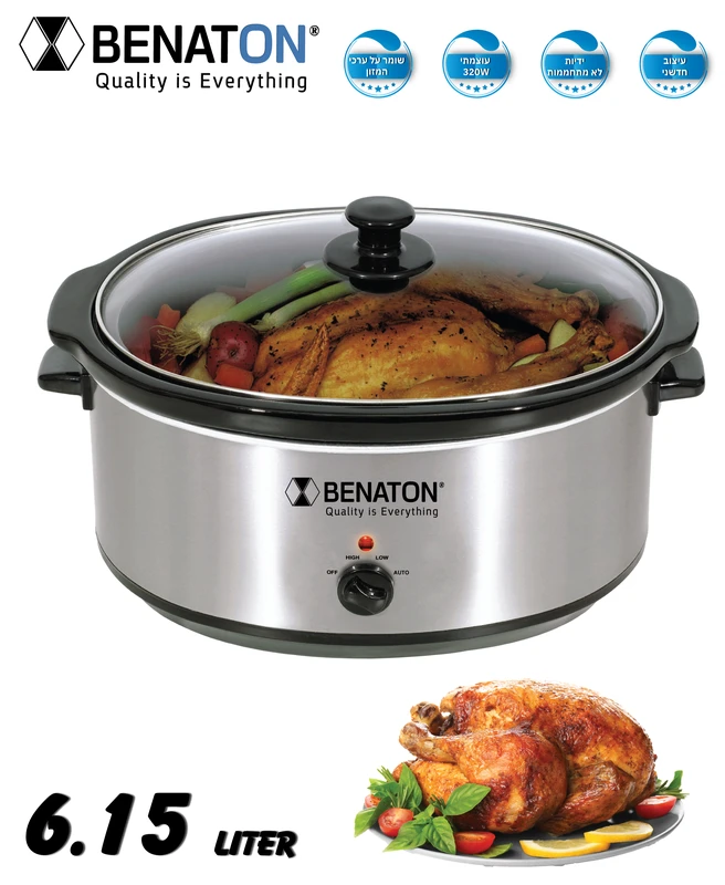 סיר חשמלי לבישול 6.15 ל׳ איטי סיר פנימי עשוי מקדירת חרס מתאים לחמין, צ׳ולנט ועוד BT-6055 מבית BENATON