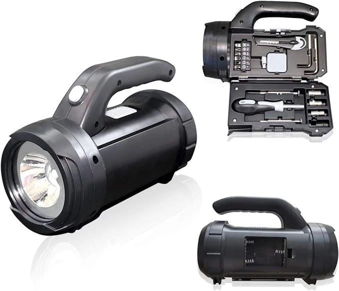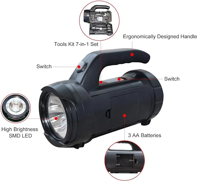 מנורת קמפינג LIGHT-RX340 עם ארגז כלים, מקור האור הוא בהירות גבוהה 6LED+4LED מהבהבת באדום, לספק הכוח צריך 3 סוללות יבשות "AA"