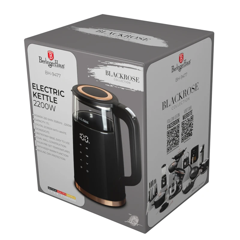עיצוב יוקרתי, טכנולוגיה מתקדמת ופונקציונליות מושלמת – הקומקום מסדרת Black Rose של Berlinger Haus מביא למטבח שילוב אידיאלי של סטייל ונוחות. עם גוף זכוכית עמיד במיוחד ותצוגה דיגיטלית חכמה, הוא הופך את הרגעים הקטנים של הכנת תה או קפה לחוויה אלגנטית.