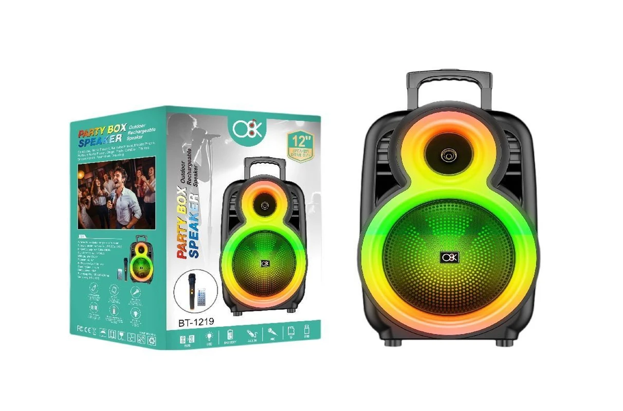 רמקול עם תבנית ייצור ייחודית, משלב דרייבר 12 אינץ’ עוצמתי וטוויטר, עם תאורת RGB היקפית ומסך תצוגה נוח – מושלם לקריוקי, מסיבות, ואירוח עם סטייל.