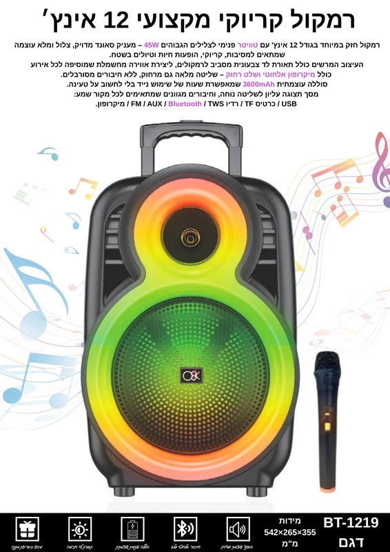 רמקול קריוקי 12 אינץ’ Bluetooth עוצמתי עם מסך תצוגה BT-1219