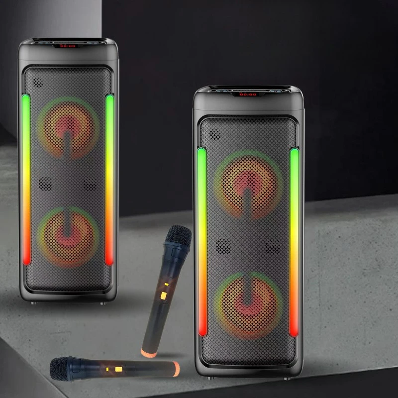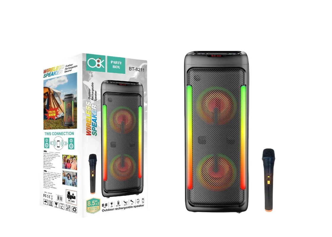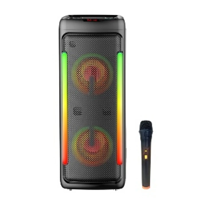רמקול גדול ומרשים עם תבנית ייצור פרטית (Private Mold), זוג רמקולים 8.5 אינץ’ + טוויטר, תאורת לד צבעונית לאורך הרמקול, מיקרופון אלחוטי ותמיכה מלאה בקישוריות – הבחירה המושלמת לקריוקי, מסיבות, הופעות או סתם ליהנות מסאונד חזק.