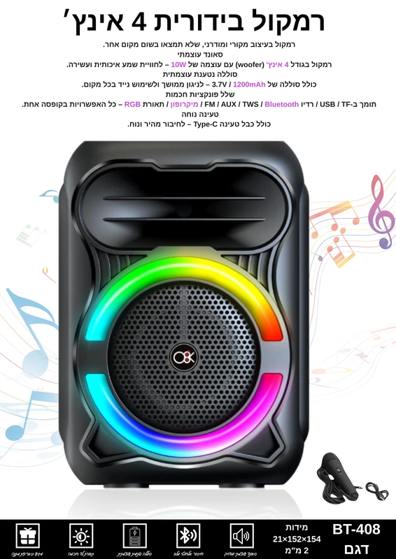 רמקול 4" Bluetooth עוצמתי עם עיצוב חדשני BT-408
