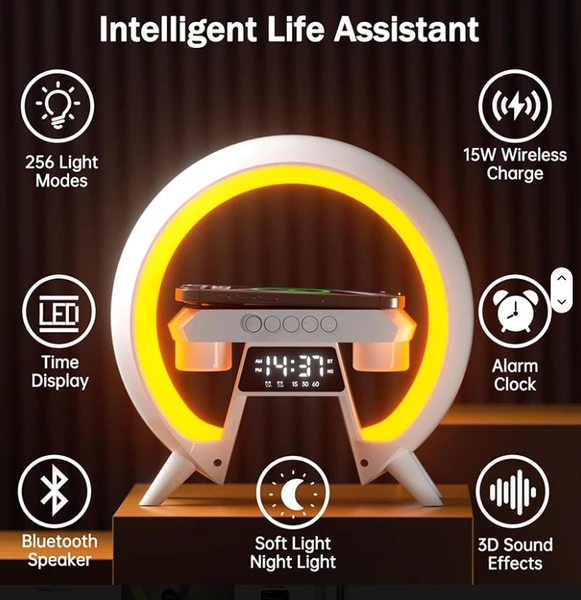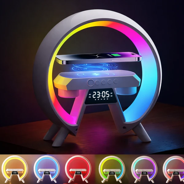 הכירו את הפתרון המושלם לשולחן העבודה, לחדר השינה או כמתנה יוקרתית – רמקול חכם בעיצוב טבעתי מודרני עם תאורת RGB מרהיבה, שעון דיגיטלי מובנה ומשטח טעינה אלחוטית.